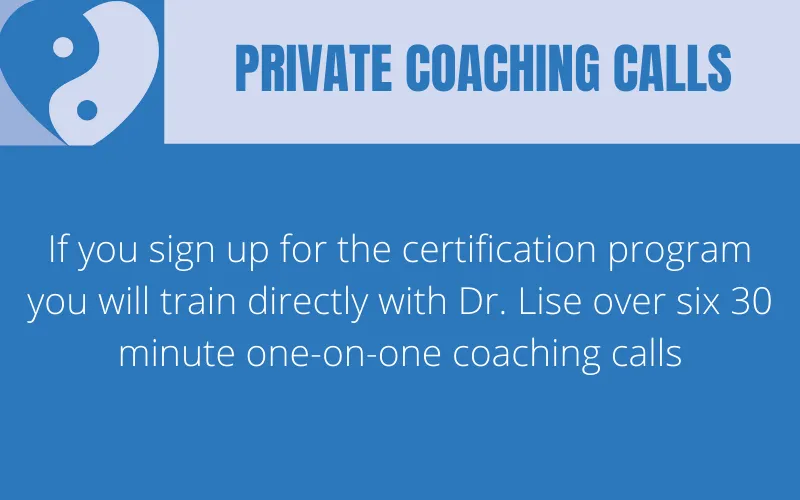 Our in-depth 6-month training includes 6 half hour one-on-one coaching sessions, a 2-day interactive group workshop, monthly group coaching, video lessons and email access to Dr Lise. You are also asked to complete some assignments. You have the flexibility to complete the program at your own pace within six months, or adjust according to what is most feasible for you.